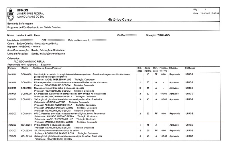 O cumprimento da carga horária e da realização de trabalhos, bem como participação em conferências e outros eventos, ocorreu dentro da normalidade em todas as unidades acadêmicas. Cumpri 29 créditos de um mínimo de 12 exigidos pela Capes e conforme regras da própria UFRGS, deixando inclusive de cursar quatro unidades acadêmicas por conta de compromissos do cargo ocupado no Ministério da Saúde, constando no histórico escolar como reprovado. Ou seja, não pude fazer todas as disciplinas, mas as que fiz cumpri o mínimo de 75% e somei mais créditos do que o mínimo necessário.