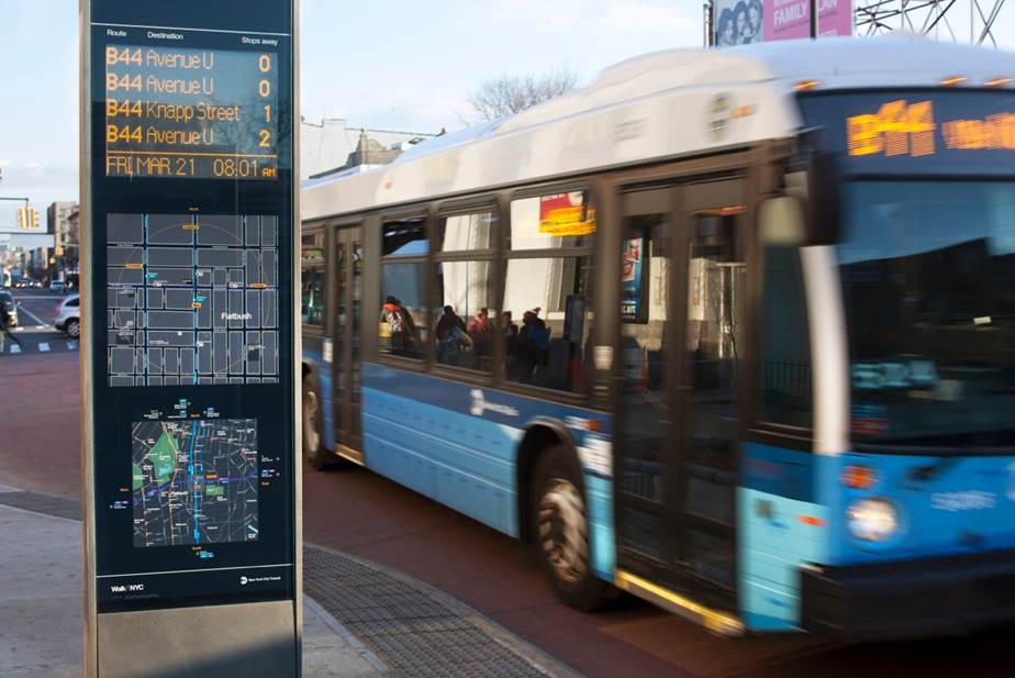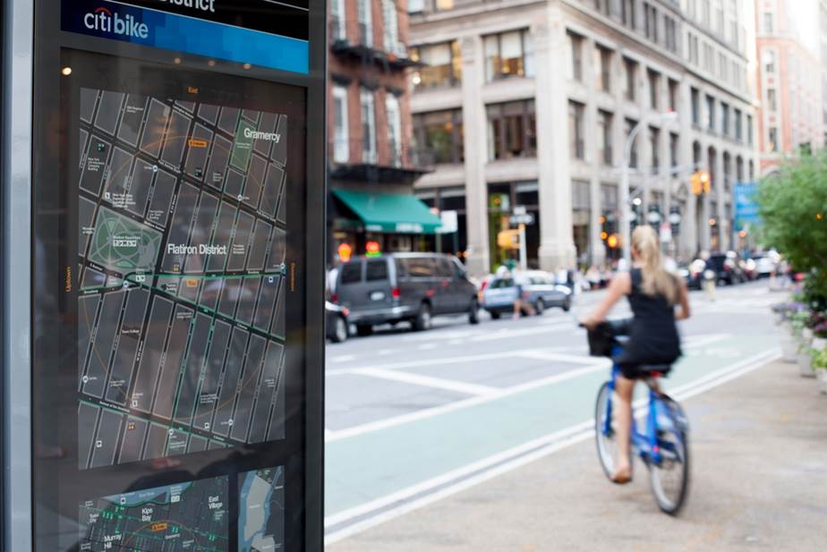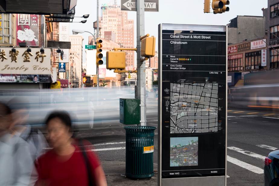 Também com foco no pedestre, o programa WalkNYC, em Nova York, reuniu um grupo de craques no design de diferentes escritórios e da prefeitura da cidade. São mapas impressos em vinil colados a vidros, espalhados pelas ruas. Neles, há informações sobre distância de pontos turísticos e transporte público. O programa começou a ser implantado em 2013 em regiões como Queens, Brooklyn e Midtown Manhattan. Foram criados desenhos dos pontos turísticos e uma identidade visual exclusiva, que acompanha o conceito da marca do sistema de metrô da cidade.