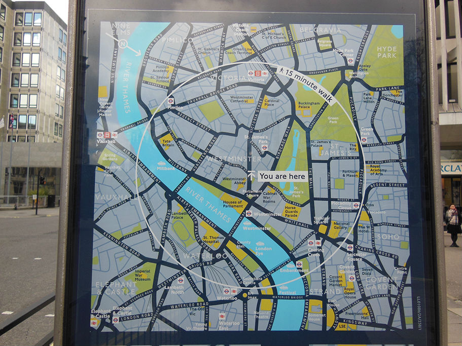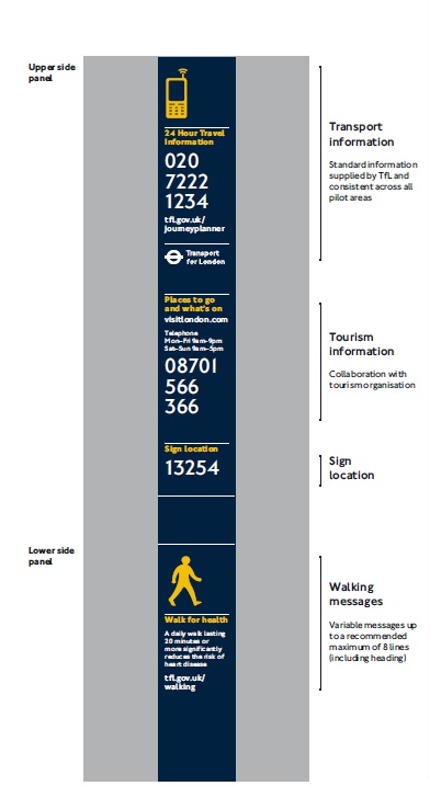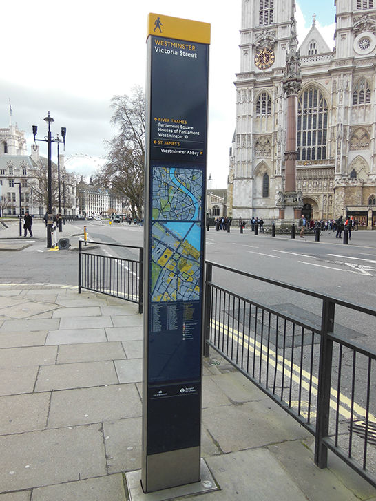 Uma verdadeira miscelânea de tipos de sinalização para pedestres formava o sistema de informação para turistas e moradores que percorriam a cidade a pé, principalmente na área mais central de Londres. Como era de se esperar, o resultado era a dificuldade de localização para quem precisava cruzar as vias e pontos turísticos da capital inglesa. Mais de mil totens foram instalados nas quadras da área central da cidade, contendo informações sobre os pontos turísticos próximos, com mapa identificando distância e tempo de caminhada até eles.
