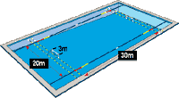 A área de jogo na piscina tem 30mx20m (25mx17m na versão feminina) com uma