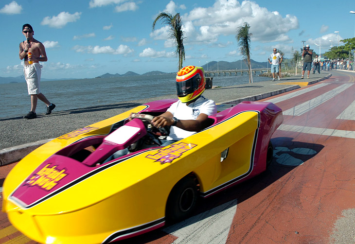A pista de ciclismo da avenida Beiramar Norte não estava em um dia comum. No lugar das bicicletas, dois karts coloridos chamavam a atenção do público catarinense. Antonio Pizzonia pilotava um, enquanto Xandinho Negrão protagonizava em outro kart a largada simbólica do Desafio das Estrelas.