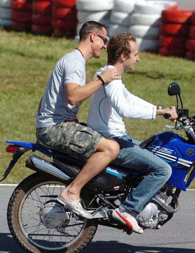 Schumi foi recepcionado por Massa no hotel, tomou um banho e depois chegou num Vectra ao kartódromo. Em seguida, o alemão subiu na garupa da motocicleta do piloto de testes da Ferrari, o italiano Luca Badoer, e fez um reconhecimento da pista.