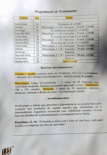 O plano é uniforme para todo o grupo, mas alguns jogadores mereceram adendos especiais, com recomendações para compensação de exercícios ou reforço em algumas áreas. Para que os boleiros cumpram o programa de treinamentos, foi feito um trabalho prévio de conscientização. Dudu conta que vem conversando com eles há cerca de 10 dias. No pé da página, embaixo das recomendações, há um texto de motivação e um versículo bíblico.