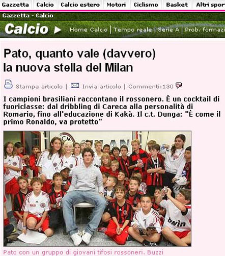 Ainda sem ter jogado uma só partida oficial pelo Milan, Alexandre Pato já está cheio de moral na Itália. Na edição desta terça-feira do jornal italiano La Gazzetta dello Sport, o atacante é comparado a grandes estrelas do futebol brasileiro. Segundo o diário, Pato tem a personalidade de Romário, a técnica de Careca e a elegância de Kaká.