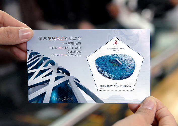 Entrou em circulação, também, um envelope comemorativo com a imagem do Estádio Nacional, conhecido como Ninho do Passarinho, por 6 yuans (cerca de 80 centavos de dólar). Esta é quarta série de selos comemorativos da Olimpíada emitidos pela China desde que o país foi escolhido, em julho de 2001, para sediar o maior evento esportivo do planeta.
