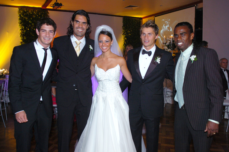 O jogador Rafael Sobis casou-se nesta quinta-feira. Seu empresário Jorge Machado e a mulher estavam entre os padrinhos, assim como Fernandão e Tinga, acompanhados das esposas, Fernanda e Milene, respectivamente.