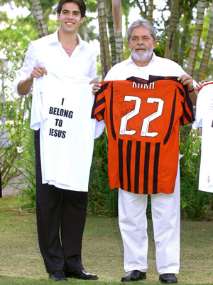 O presidente Luiz Inácio Lula da Silva recebeu, nesta sexta-feira, o melhor jogador do mundo na Granja do Torto, sua residência oficial: Kaká, do Milan, que aproveitou para presentear Lula com três camisas. Além da tradicional rubro-negra do Milan e da branca, reserva, Kaká entregou também um modelo com a inscrição em inglês "I belong to Jesus" (Eu pertenço a Jesus), uma réplica da que foi usada pelo brasileiro por baixo do uniforme do Milan na final do Mundial de Clubes (4 a 2 sobre o Boca Juniors).