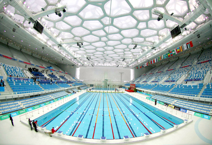 Pequim abriu hoje as portas do Centro Aquático Nacional, conhecido popularmente como O Cubo de Água devido a sua estrutura retangular, coberta por singulares membranas plásticas poliédricas que permitem a passagem da luz natural. A obra é um dos principais projetos dos Jogos Olímpicos.