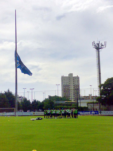 A bandeira do Grêmio está hasteada a meio palmo, em sinal de luto pela morte de dona Erna Klein, diretora do bolão do clube,que ocorreu no último sábado.