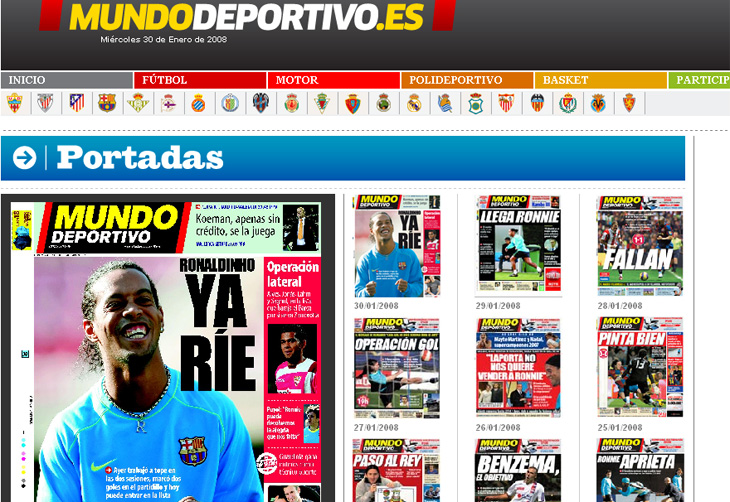 Ronaldinho se recuperou de uma tendinite patelar, que o deixou de fora de todos os jogos do Barcelona em 2008 até agora. O mesmo jornal publica uma foto destacada do lateral-direito brasileiro Daniel Alves, do Sevilla, e o inclui em uma lista de jogadores pretendidos pelo Barcelona para a posição.
