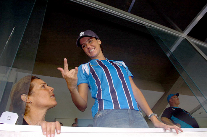 A atriz Deborah Secco era uma princesa em seu balcão, sábado à tarde, nas tribunas de honra do Estádio Olímpico. Magrinha e sorridente debaixo de um boné azul-escuro, abanava para os súditos nas arquibancadas e batia amorosamente no distintivo da camisa personalizada do Grêmio que usava. Estava ladeada por Geuse, mãe de Roger, e por Odete, mulher do diretor de futebol Paulo Pelaipe. Atrás delas, três seguranças engravatados e casmurros desestimulavam a aproximação de qualquer fã mais afoito. Mas Deborah não parecia preocupada com o assédio. Ao contrário: deu autógrafos, posou para fotos colhidas por celulares e cumprimentou os torcedores que, das cadeiras, erguiam as mãos, ansiando por tocá-la.