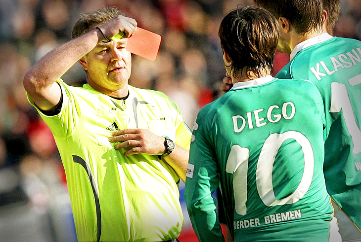 A peitada em Krygiakos, do Eintracht Frankfurt, e a conseqüente expulsão vão custar caro ao meia Diego, do Werder Bremen e da Seleção Brasileira. Ele foi punido com três jogos de suspensão pela Federação Alemã e só poderá voltar a defender a equipe na luta pelo título alemão no dia 22 de março, em visita ao Arminia Bielefeld.