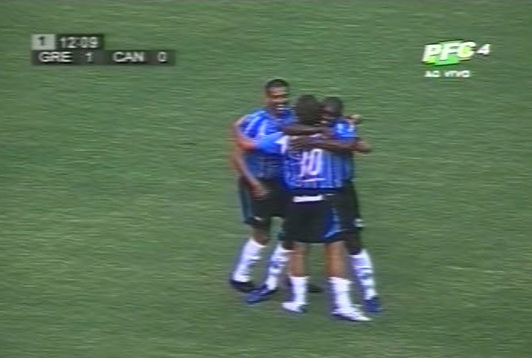 Grêmio abre o placar aos 12 minutos no Olímpico. A dupla Julio dos Santos e Roger tabelou e o camisa 10 chutou forte da entrada da área. Um a zero para o Grêmio contra a Ulbra.