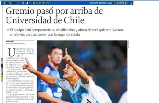 – Os azuis (como é chamado o time chileno) caíram diante do Grêmio e sofreram a primeira derrota em casa na Libertadores (...). No jogo disputado em Porto Alegre, o La U tinha conseguido um angustiante empate sem gols. Desta vez, o time brasileiro conseguiu a revanche – diz a publicação.