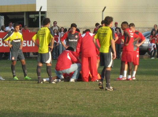 No treino do Inter na tarde desta quinta, no Beira-Rio, uma cena causou preocupação. Alecsandro se chocou com um adversário e levou a pior. Após bater joelho contra joelho, o centroavante ficou caído no gramado durante alguns minutos. Depois de ser atendido no gramado, levantou-se e deixou o treino.
