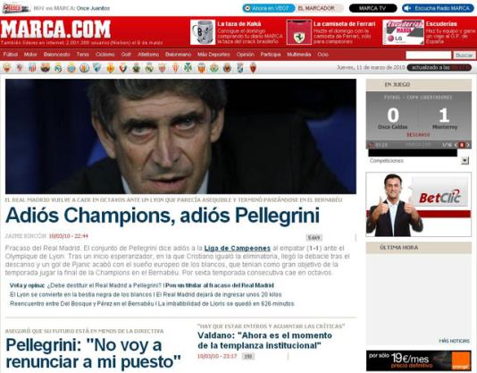 A eliminação na Liga dos Campeões frente ao Lyon deve custar o cargo de Manuel Pellegrini. De acordo com o jornal Marca, sua demissão é dada como certa. O Real Madrid, no Santiago Bernabéu empatou em 1 a 1 com a equipe francesa e, pelo sexto ano consecutivo, caiu nas oitavas de final da competição.