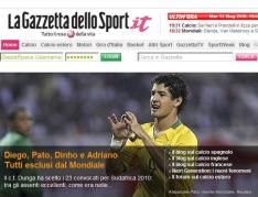 A manchete da Gazzetta dello Sport segue a mesma linha: "Diego, Pato, Dinho e Adriano. Todos excluídos do Mundial". O Gazzetta comenta que Adriano ficou de fora por problemas fora de campo e negligência no Flamengo. A publicação cita ainda que, mesmo contestados em seus clubes, Felipe Melo, Doni e Júlio Baptista garantiram lugar no Mundial.