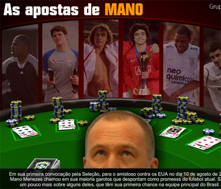 Para o amistoso que marcará sua estreia como técnico da Seleção, contra o Estados Unidos, Mano Menezes chamou diversos atletas que despontam como promessa para o futebol brasileiro. Conheça mais destes jogadores que terão a primeira chance vestindo a camiseta canarinho clicando no gráfico abaixo: