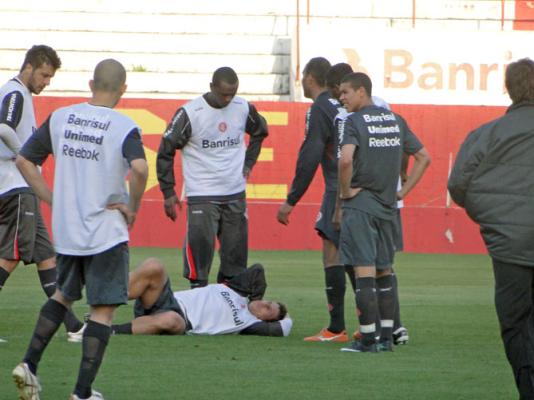 O técnico Celso Roth organizou um treino coletivo no final da tarde desta sexta-feira, no gramado principal do Beira-Rio. Na atividade, um problema para o treinador. Em uma dividida com Alecsandro, Índio levou a pior.