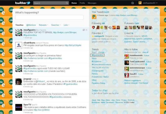 A hashtag #figueiravoltou, em alusão ao retorno do Figueirense à elite do futebol brasileiro está no topo da lista do TT Brasil, lista de tópicos mais discutidas no Twitter aqui no Brasil.