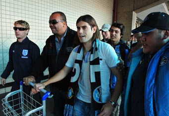 No início da tarde, foi a vez do argentino Miralles desembarcar na capital gaúcha. Os torcedores que esperavam o jogador entregaram para o jogador uma manta com as cores do Grêmio.