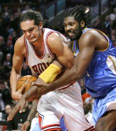 Joakim Noah, do Chicago Bulls, disputa bola com o brasileiro Nenê, do Denver Nuggets