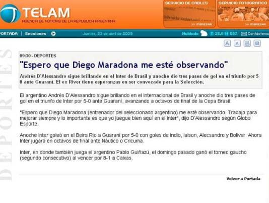 As boas atuação do meia D'Alessandro não têm repercutido apenas no Brasil. A imprensa argentina destacou as declarações do jogador, que pediu uma nova chance na seleção argentina. "Espero que Diego Maradona esteja me observando", foi o título de uma reportagem publicada no site da Telam, principal agência pública de notícias da Argentina.