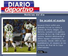 Os jornais colombianos destacam nesta quarta o fim da participação do país na Copa Libertadores deste ano após a derrota por 3 a 0 do Boyacá Chicó para o Grêmio no Olímpico, na noite desta terça. O Chicó tinha chance de levar a segunda vaga, mas dependia de um tropeço do Universidad de Chile diante do Aurora, no mesmo horário do jogo em Porto Alegre. Os chilenos venceram por 2 a 1, na Bolívia.