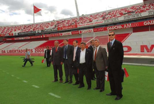 A comitiva da Fifa que está em Porto Alegre, composta por 10 pessoas, vistoriou o Beira-Rio e conheceu o projeto de reforma do estádio do Inter na manhã deste sábado. O grupo chegou ao local às 9h50min, 10 minutos antes do previsto. Eles entraram pelos camarotes, ao lado da presidência do clube, e tiraram fotos com a imprensa. Antes de deixar o Beira-Rio, o presidente Ricardo Teixeira, afirmou: