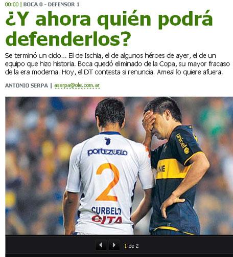 A principal crítica é contra o técnico Carlos Ischia. De acordo com a edição online da publicação argentina, um dirigente do Boca disse no vestiário, após a derrota para o Defensor, que o treinador não pode continuar no comando da equipe, e quem deveria assumir o cargo seria Carlos Bianchi. Esse seria o pensamento da maioria dos dirigentes do clube.