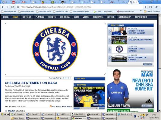 O Chelsea negou ter feito uma proposta pelo meia brasileiro Kaká, do Milan, que está negociando com o Real Madrid. A equipe de Londres publicou um comunicado em seu site para desmentir as informações que davam conta de uma oferta recorde pelo meia.