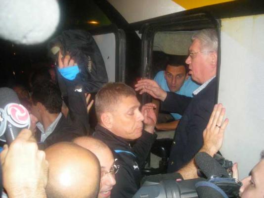 Após mais de uma hora parado, o argentino Maxi López desceu do ônibus do Grêmio que estava impedido de deixar o Mineirão. E foi acompanhado por todos os outros jogadores e também pelo técnico Paulo Autuori. Em solidariedade, eles vão acompanhar o argentino até a delegacia para prestar depoimento.