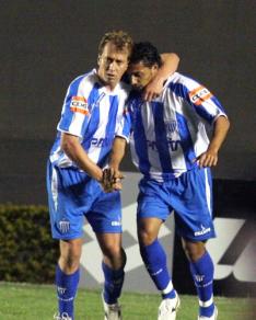 Marquinhos (esq.) comemora com Roberto o segundo gol do Avaí no Serra Dourada