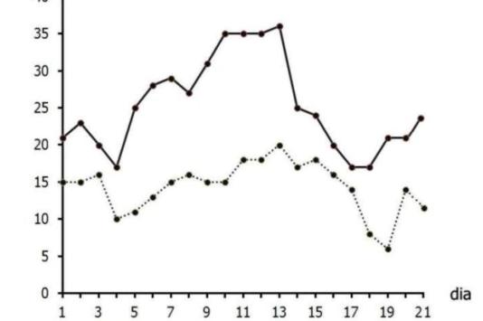 O gráfico abaixo mostra o registro das temperaturas máximas e mínimas em uma cidade, nos primeiros 21 dias do mês de setembro de 2013.