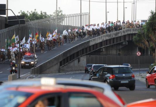 Um grupo de cavalarianos, vindo de Eldorado do Sul, chegou à Capital por volta das 17h trazendo a centelha que, às 18h, abre oficialmente o Acampamento Farroupilha.