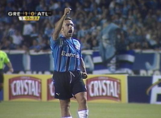 5min - GOL DO GRÊMIO - Roger sofre o pênalti, ao entrar na área pela direita. Ele mesmo cobra e converte, mandando no canto esquerdo de Márcio