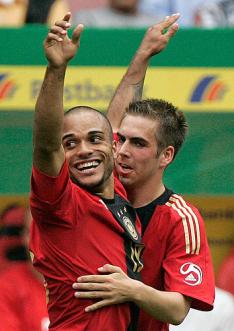 Odonkor e Lahm comemorando o segundo gol da Alemanha, marcado contra por Korytko