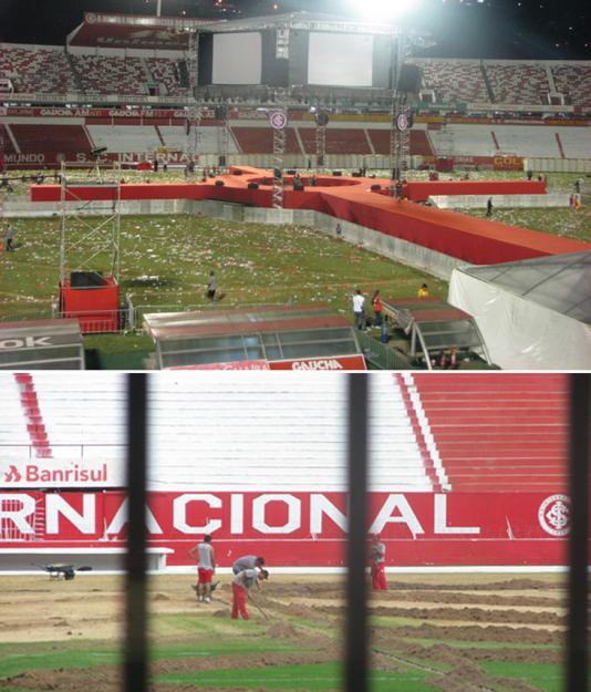 O gramado do Beira-Rio ficou seriamente danificado após a festa do Centenário, realizada na quinta-feira. Nesta semana, funcionários do Inter trabalham na restauração do campo.
