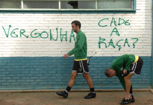 "Vergonha" e "Cadê a raça?" estavam escritos na cor verde, a cor do clube. Em 17 jogos, foram apenas três vitórias, seis empates e oito derrotas. Até esta rodada, a penúltima do Returno, o desempenho da Chapecoense é de apenas 29%.