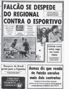 "Falcão se despede do Campeonato Gaúcho, hoje à tarde, contra o mesmo time que enfrentou na sua estreia no estadual, em 1973: o Esportivo. Tanto para o craque, quanto para os torcedores, o jogo já pode ser considerado histórico. Conforme declarou o técnico Ênio Andrade, a equipe será a mesma que disputará contra o Nacional a primeira partida da final da Libertadores, na próxima quarta-feira. A única novidade é Cléo, que poderá entrar no lugar de Tonho, garantiu o treinador."