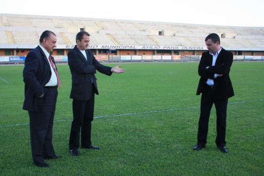 O presidente Francisco Novelletto (C), ao lado do empresário Elson Macedo, caminhou pelo estádio do Gre-Nal, em Rivera