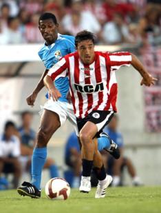 Juan Salgueiro (à direita), do Estudiantes, escapa da marcação de Edwin Pérez, do Sporting Cristal