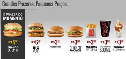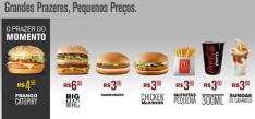 O McDonald’s incrementou a promoção Grandes Prazeres, Pequenos Preços e incluiu o Big Mac como opção com desconto. O sanduíche ícone da marca está sendo vendido por R$ 6. Além disso as ofertas por R$ 3 continuam com o Chicken Junior, Hamburguer, Coca-cola 300ml, McFritas pequena e o Sundae de caramelo.