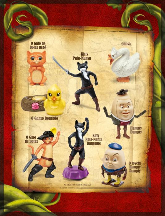As surpresas são miniaturas dos principais personagens do filme: Gato de Botas, Humpty Dumpty, Gansa, Kitty Pata-Mansa, Ganso Dourado, O Gato de Botas Bebê, o Jovem Humpty Dumpty e Kitty Pata-Mansa Dançante. Cada uma das surpresas traz uma função diferente, com movimentos e sons.