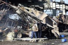 Um homem segura um retrato de Kadafi nos escombros de uma das bases navais atacadas na noite de segunda-feira