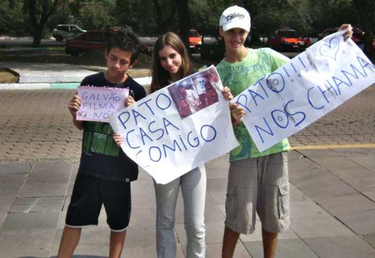 O atacante Alexandre Pato foi pedido em casamento na entrada do hotel Deville, onde a Seleção está hospedada para a partida contra o Peru nesta quarta. O pedido não foi formal, mas não resta dúvida de que ele seria concretizado caso a resposta do jogador do Milan fosse positiva. Postada na entrada principal do hotel, Francine Simões de Oliveira, 15 anos, erguia um cartaz com a frase: "Pato, casa comigo".