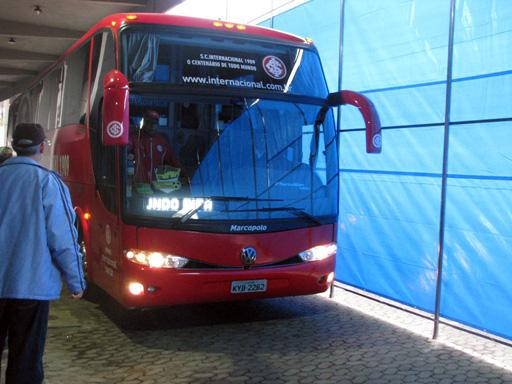 Após um percurso tranquilo da concentração ao Olímpico, o ônibus do Inter estacionou no pátio do estádio às 14h55min. Os jogadores e dirigentes colorados desembarcaram sob os gritos de incentivo da torcida e se encaminharam para o vestiário para a preparação final para o Gre-Nal das 16h.