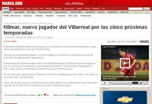 De acordo com matéria publicada pelo diário espanhol Marca, com declarações do presidente do Villarreal, Nilmar será jogador do clube por cinco anos. E mais do que isso: será a contratação mais cara feita pelo clube até hoje.