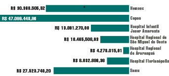 Enquanto uma solução definitiva não vem, o governo se apoia em aportes emergenciais ou remanejamentos de verbas, algumas delas ainda no campo da estimativa. A Fazenda até já divulgou o passo a passo para empresas privadas interessadas em fazer doações ajudarem a saúde e o governador Raimundo Colombo já prometeu R$ 400 milhões de recursos extras até o fim do ano. Deste valor, porém, a única parte que o Centro Administrativo tem mais certeza de conseguir destinar à pasta é os R$ 80 milhões que serão economizados até dezembro com a diminuição na participação patronal no SC Saúde, de 4,5% para 0,5%. O restante ainda depende dos resultados do Programa Catarinense de Recuperação Fiscal e da mudança na administração do Porto de São Francisco.