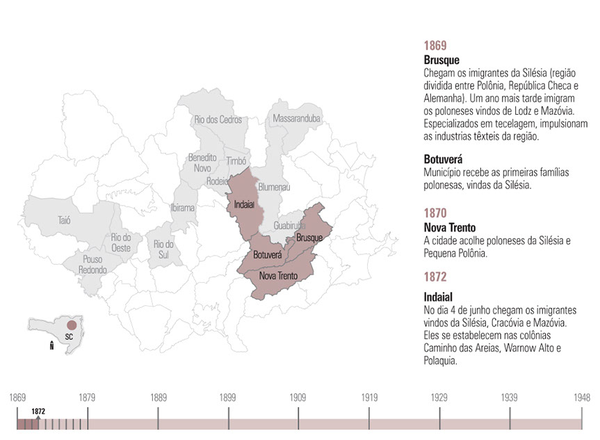Entre 1850 e 1897 aportaram, no Vale do Itajaí, imigrantes de 21 nacionalidades. Belgas, russos, até gregos! Dentre estes estavam os poloneses, de uma Polônia que na época também não existia como país soberano. Traziam consigo a crença em Nossa Senhora Czestochowa, a arquitetura de sótãos baixos e lambrequins, o idioma eslavo. Não rezavam na crença de Lutero, não pactuavam da mesma cartilha. Eram mão de obra para a colônia, entretanto, braços para a lavoura, e logo tratou-se de alojá-los nos confins do novo território. Lá, onde a terra era mais bravia, a vida mais difícil. Lugares como a Vila Itoupava, o bairro mais polonês de Blumenau.